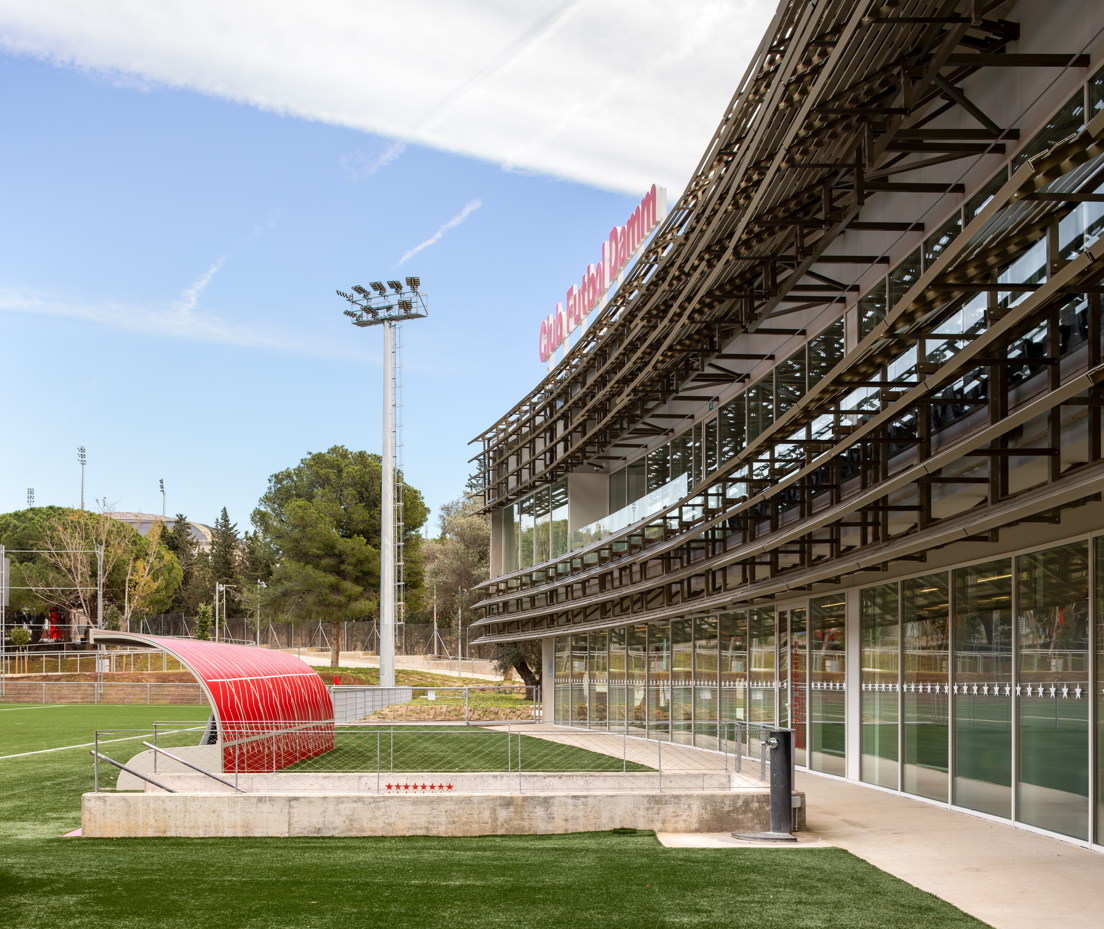 El nuevo complejo deportivo de la Fundación Damm es una obra conjunta de los estudios de arquitectura barceloneses Max de Cusa y Hiha Studio, que se integra en el paisaje de la montaña de Montjuïc y ofrece unas instalaciones libres de emisiones de CO₂ y respetuosas con el medio ambiente. Con un consumo totalmente eléctrico alimentado por placas fotovoltaicas y un sistema de almacenamiento de agua de lluvia para el riego y mantenimiento de los campos, el resultado han sido unas instalaciones Nearly Zero Energy Building (NZEB)* y energéticamente autosuficientes.