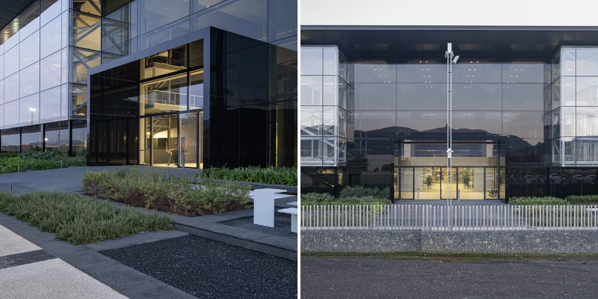 Un elegante y minimalista edificio dibujado con un acristalamiento en continuo, sujeto solamente por la parte superior e inferior.