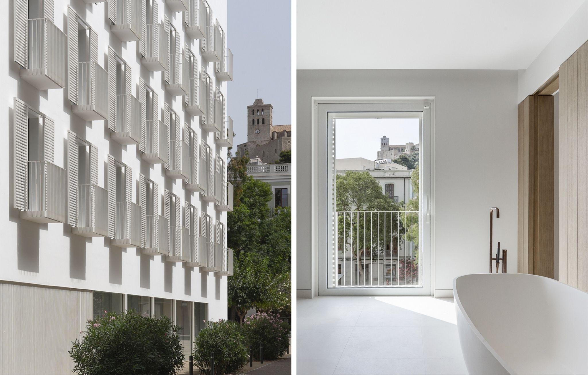 El hotel boutique Standard (Hyatt), situado en una céntrica esquina de la calle de Vara del Rey, presenta una formal y uniforme fachada, donde el estudio OAB ha aplicado un matemático hueco de 1,20×2,30m. con portones alistados y cerramientos lacados en blanco, para dejar que sólo el juego de la luz y las sombras realcen esta redefinida arquitectura ibicenca pura y actualizada.