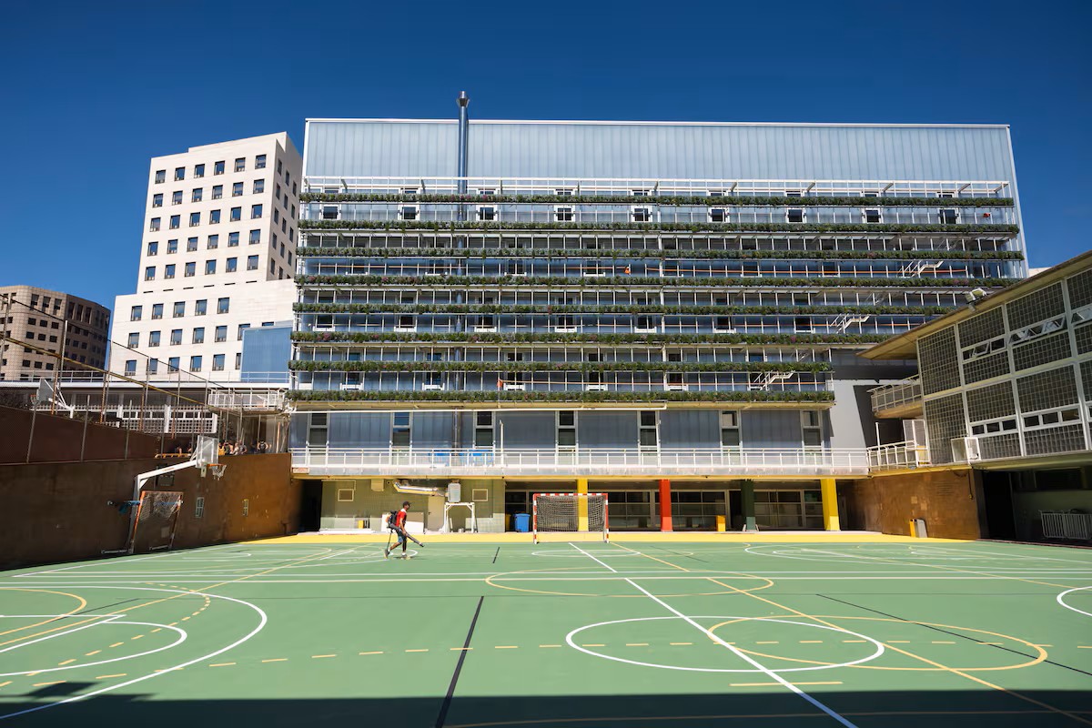 “El nuevo edificio ha supuesto un reto arquitectónico por su ubicación, encajado en un espacio complejo entre dos escuelas y el centro comercial l´Illa Diagonal. La dificultad principal ha estado levantar las pistas sobre un centro escolar, hecho que ha requerido un trabajo estructural muy exhaustivo para minimizar el impacto y garantizar que el edificio sea poco invasivo y respetuoso con el entorno.”