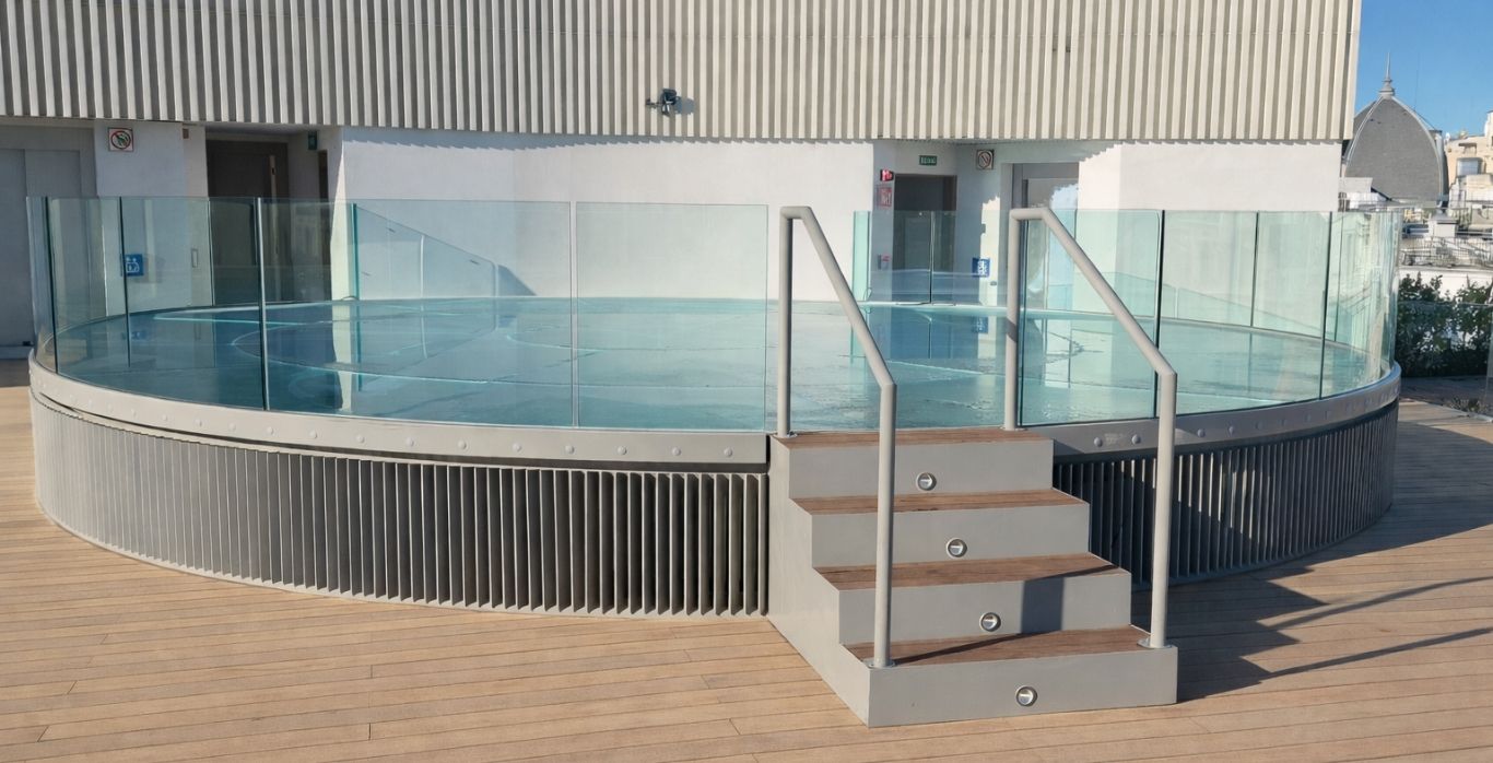Una gran circumferència formada per tres divisions circulars, que forma aquesta gran lluerna de 9,5 metres de diàmetre, amb una composició d’alta gamma, formada per un triple laminat-temperat amb la superfície exterior antilliscant (per a ús públic classe 3 de 10 mm) al costat de dos vidres temperats de 15 mm units entre 2 mitjançant .