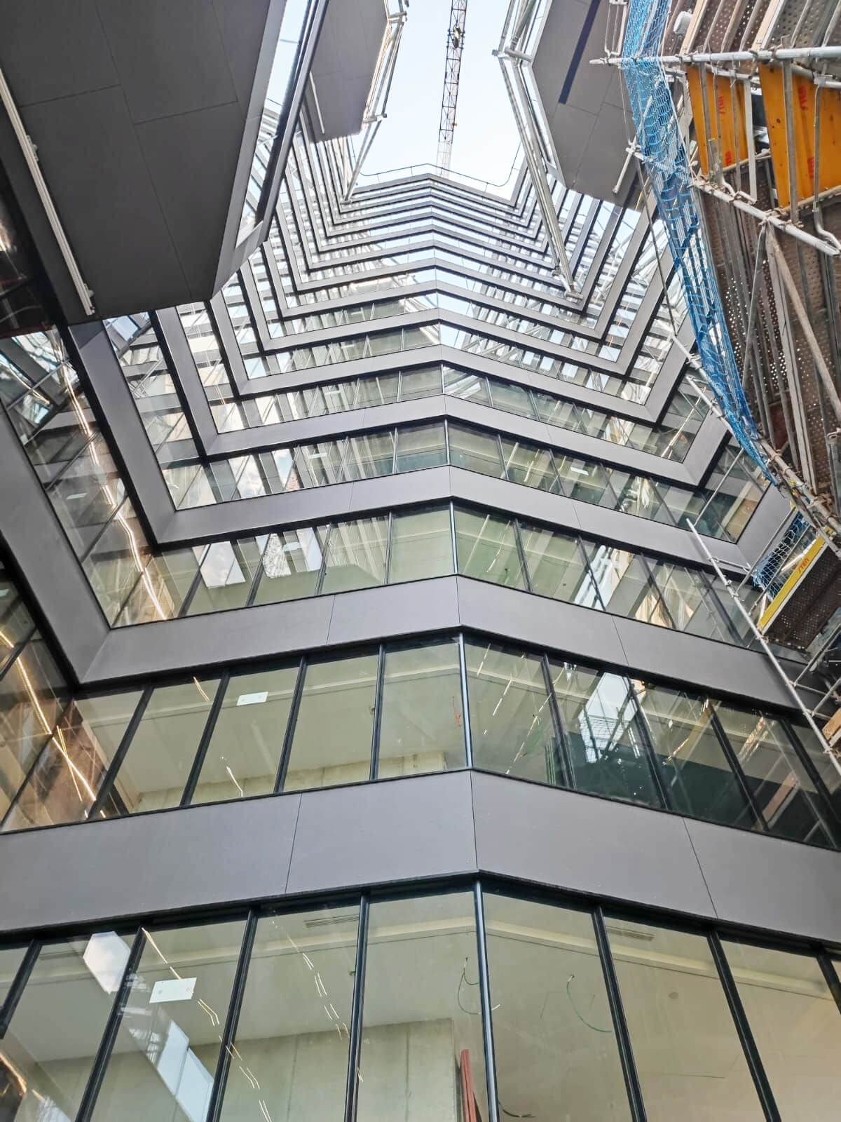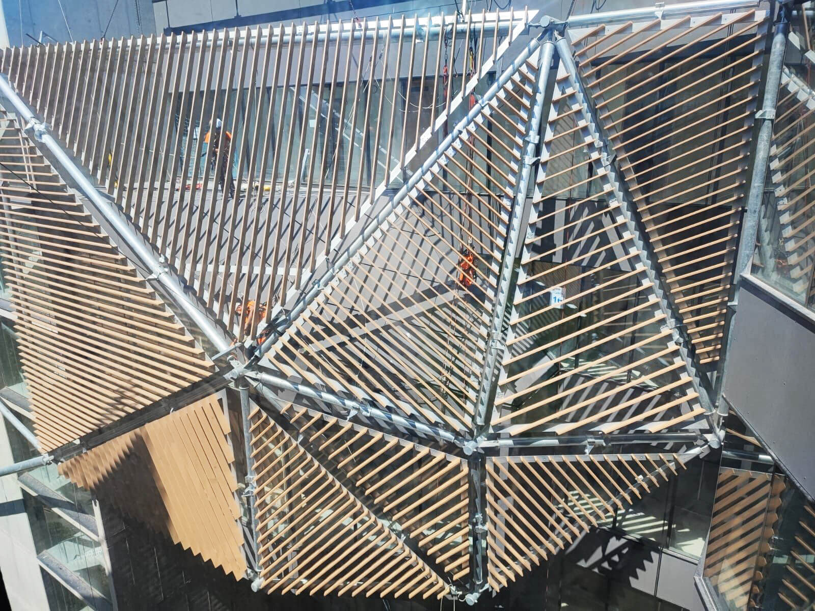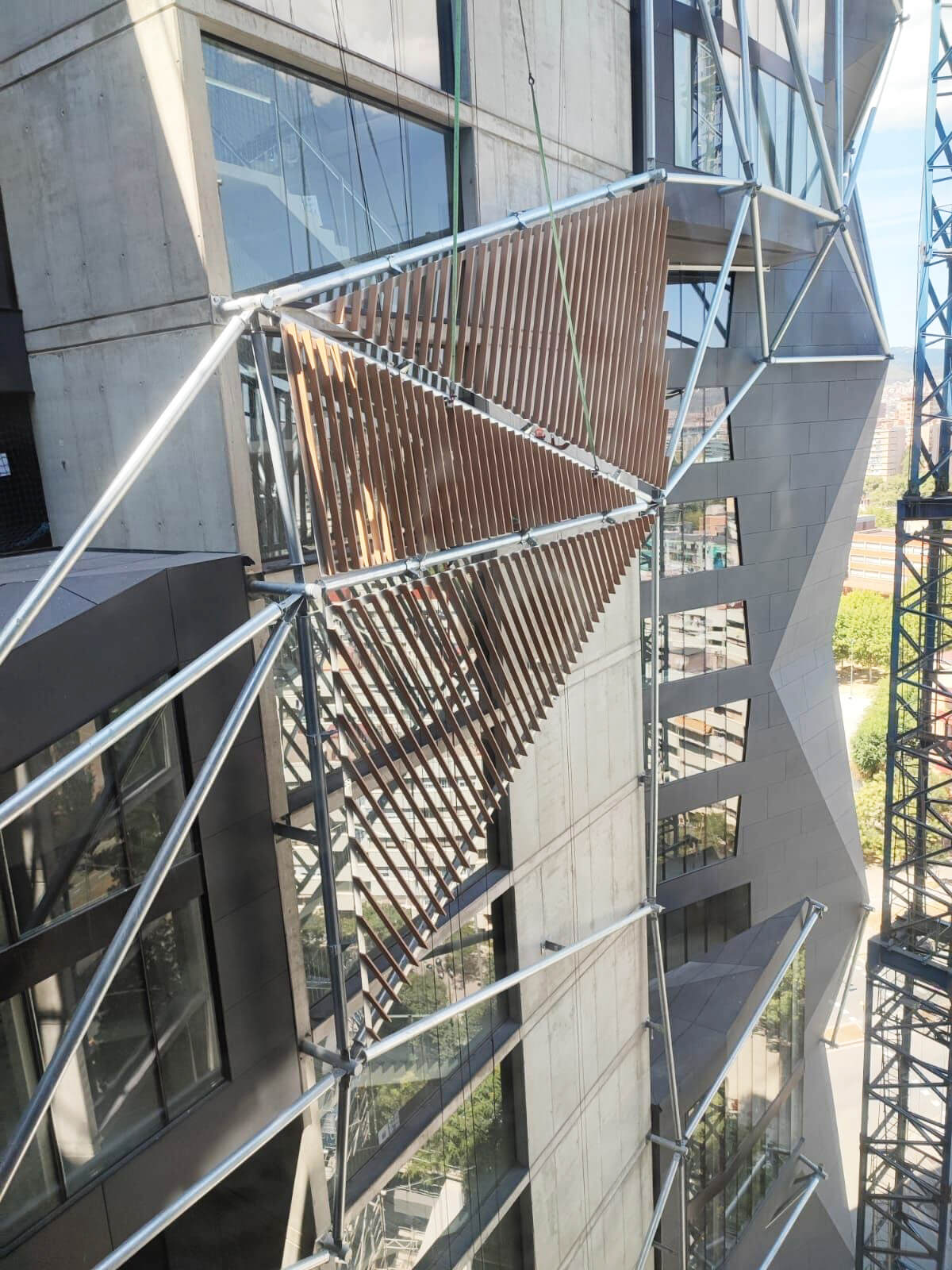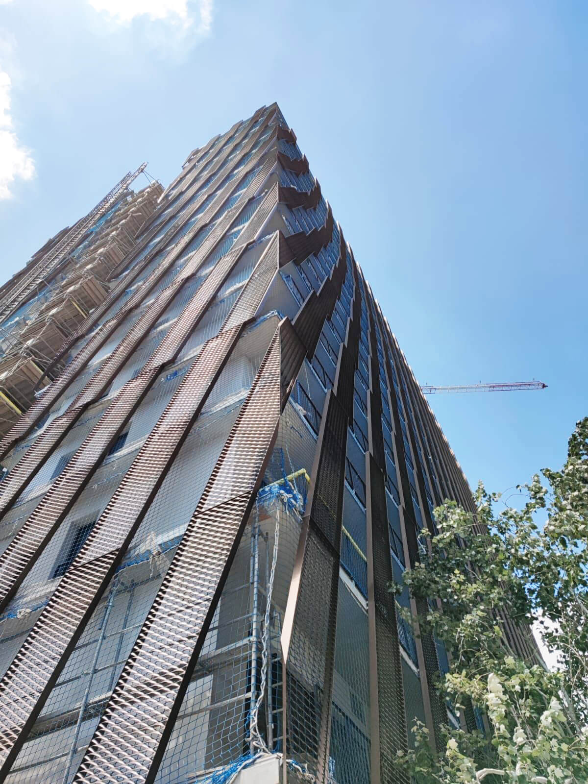 Talleres Inox está realizando un increíble trabajo, con la fachada prefabricada para atrio interior mediante sistema FACADE ACOUSTIC PANEL y la doble piel exterior realizada a base paneles de aluminio estirado tipo DEPLOYÉ.